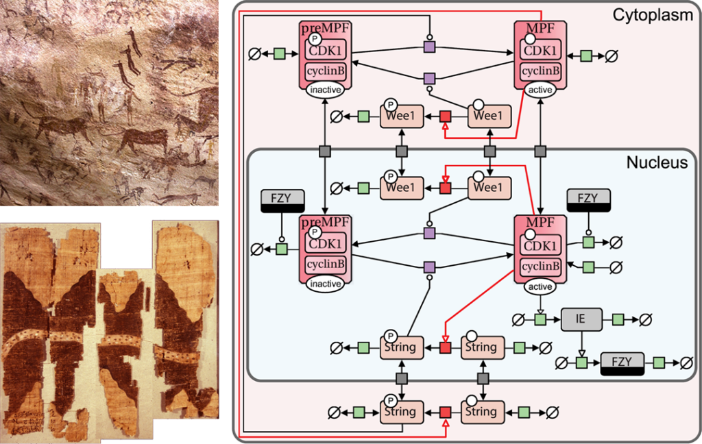 Since the era of our cave-drawing ancestors, humans have possessed innate cognitive faculties that are naturally engaged by diagrams. Diagrams notably play a key role in conveying information in biology, where they are often used to graphically represent the series of events taking place during a biological process. Such diagrams can be found in every good handbook for biology, but also in biology research papers, where they may be used to summarize the authors’ findings, for example. While these diagrams are key for the understanding of the biological processes they represent, they have for a long time remained inconsistent and ambiguous, due to a lack of a common notation. This became a major issue at the beginning of the 2000’s with the advent of computational systems biology, that focused on building, exchanging and analysing large and complex diagrams representing the molecular events occurring in whole biological systems. In other areas of science, standard visual languages such as Circuit diagrams (physics) or the Unified Modelling Language (computer science) had been proven useful to draw consistent and unambiguous diagrams, and to facilitate the use of software tools to do so.