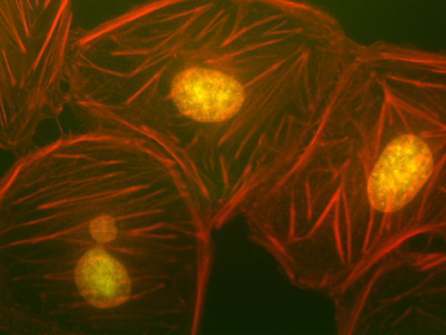 2. Nucleus: gelb durch Phalloidin, Actin: rot durch Sytox Green