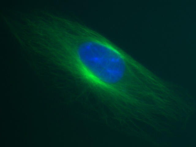 1. Nucleus: blau durch Chromamycin, Mikrotubulis: grün durch Fluorescein-konjugierte Antikörper