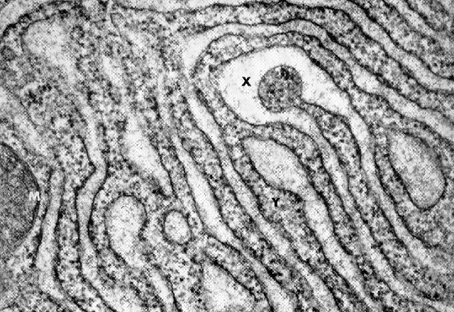 Granuläres ER einer protein-ausscheidenen Plasmazelle. M Mitochondrium, X Höhlung zwischen den Zisternen, Y Zytoplasmatische Grundsubstanz mit Ribosomen